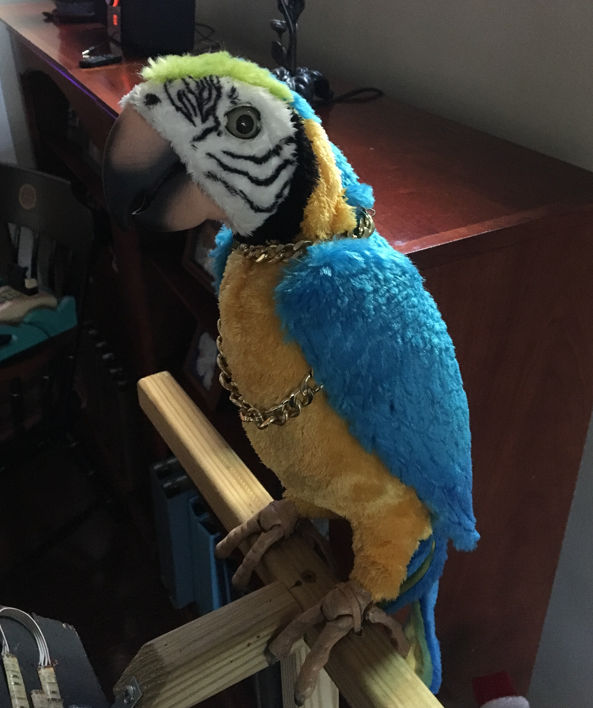 This singing, dancing parrot is based on a hacked "Fur Real Friend" with a micro-controller running the character's various motors. The controller reads a DTMF signal embedded in the character's audio stream, allowing both movement and audio data to be stored within a single mp3 file. The character is triggered using a three button show selector, allowing for 3 different shows to be played with the simple push of a button.