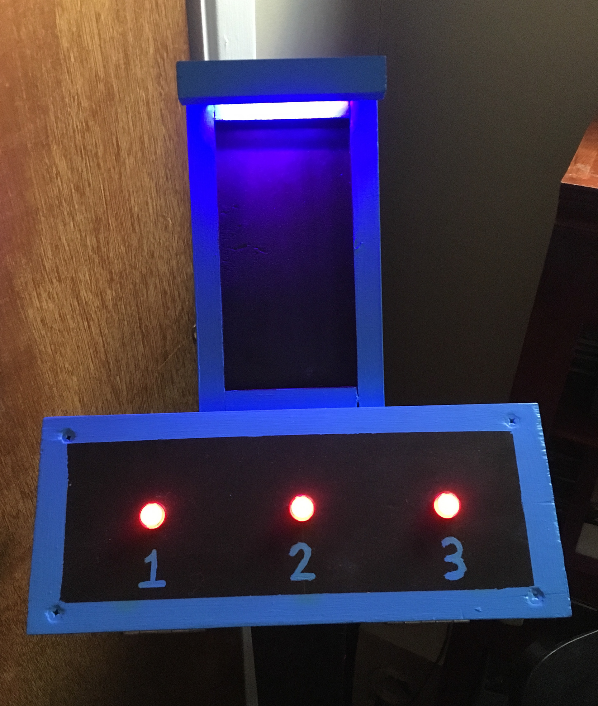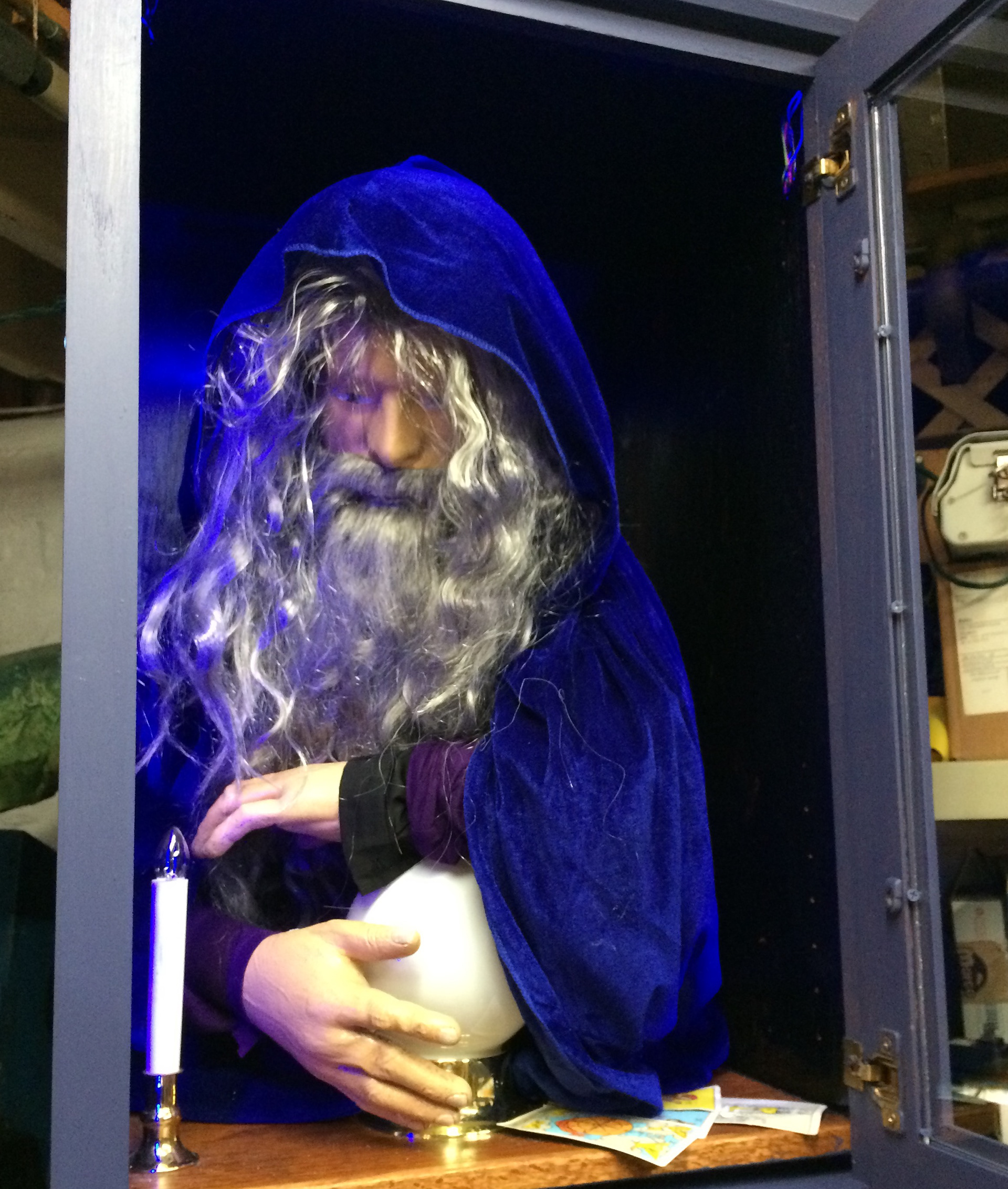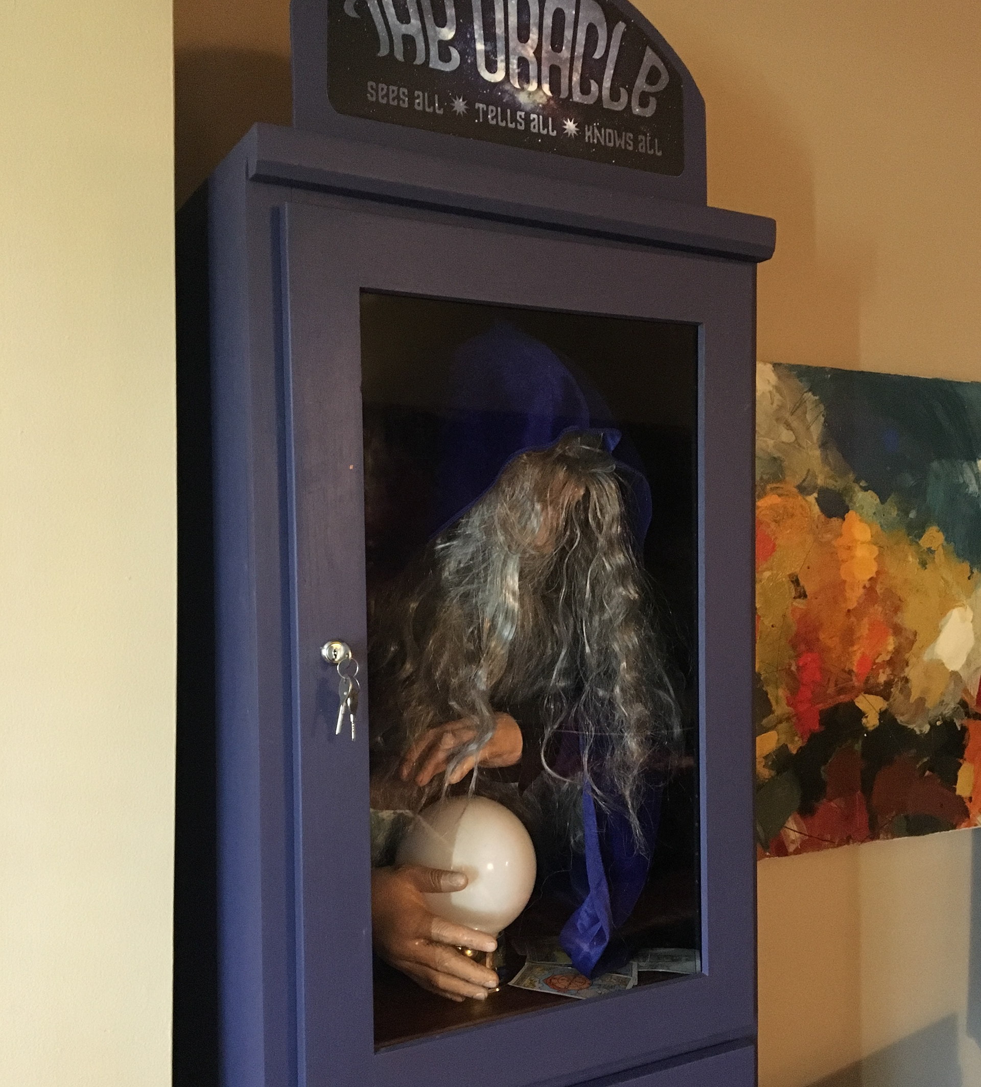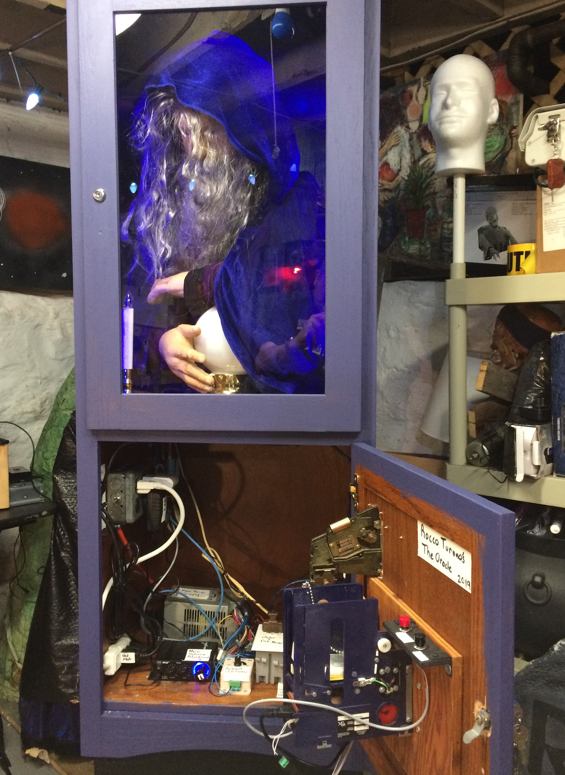 The Oracle is a classic arcade style fortune teller, complete with coin slot and card dispenser! The Oracle himself was powered by a reindeer motor, giving him the ability to sway back and forth. The whole machine was controlled by an Arduino Uno Microcontroller equipped with a sound module and a series of relays.